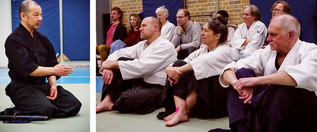 Behalve dat hij veel kennis heeft van de historische achtergronden, illustreerde George ook met tal van praktische voorbeelden hoe situatie’s in de Japanse middeleeuwen zich voordeden. Zo mocht ikzelf even voor ‘Daimio’ spelen, terwijl Bart Brolsma een frauderende Samurai speelde die ter verantwoording werd geroepen. George liet zien hoe hij de Daimio beschermde tegen een onvermoede aanslag terwijl iedereen vlak bij elkaar zat. Erg indrukwekkend. Sekiguchi ryu kan je in je eentje trainen omdat het alleen bestaat uit Iai-jutsu.